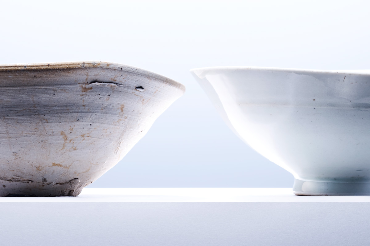 The photograph above compares two white bowls that have different light and shadow effects due to the choice of clay and glaze. The white porcelain on the right is a ware made from toseki stone, which produces an elegant gloss and soft light. On the other hand, the Yama-chawan bowl on the left is a ware made from kaolin clay, and an unglazed firing technique is used to emphasize shadow with the bowl’s matte texture.