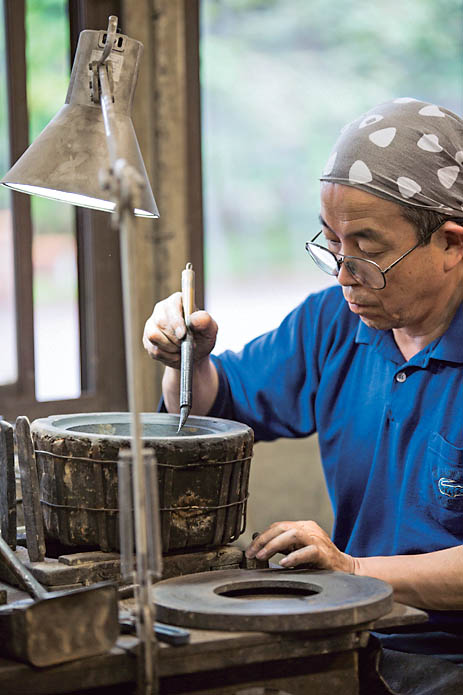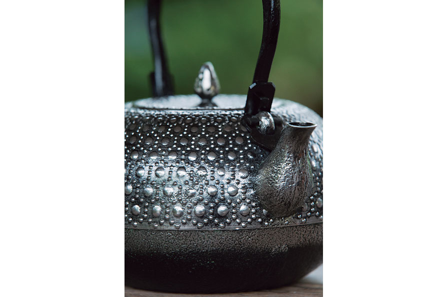 The pattern that defines Nambu iron kettles is created by artisans, who press a stick into a sand or clay mold to accurately create spots one by one. Molten iron is poured into the mold, and when the iron kettle shell is formed, lacquer and ohaguro (tooth blackening dye) are applied before it is fired. This finish is the secret behind its durability and distinctive controlled-gloss texture.